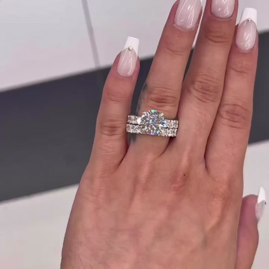 Excellent cut, polish, and symmetry, set in an eternity-style design crafted in real, solid 14K gold. This piece features a striking 7.0 carat round-cut engagement ring paired with a matching 3.0 carat round-cut eternity wedding band, masterfully set all the way around for continuous brilliance and a bold, eye-catching finish.