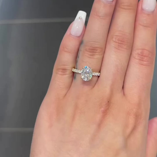 Excellent cut, polish and symmetry and is set in a classy side stones hidden halo setting in real, solid 14K gold. Classic claw prongs and a delicate basket setting securely cradle the center, allowing it to shine with maximum brilliance. This gorgeous ring showcases a breathtaking 2 carat oval-cut diamond and features a hidden diamond halo. The band is masterfully set 3/4 of the way around with beautiful pavé lab-grown diamonds, completing the simple and elegant, yet eye-catching engagement ring! You may customize this item by choosing either 14K yellow gold, 14K white gold or 14K rose gold.