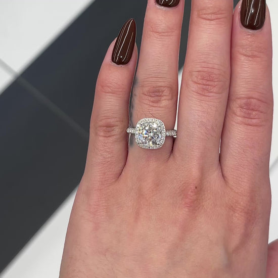 Excellent cut, polish and symmetry and is set in a classy side stones visible halo setting in real, solid 14K gold. Classic claw prongs and a delicate basket setting securely cradle the center, allowing it to shine with maximum brilliance. This gorgeous ring showcases a breathtaking 2 carat cushion-cut lab diamond center and features a visible diamond halo. The band is masterfully set 3/4 of the way around with beautiful pavé lab-grown diamonds on all three sides, completing the luxurious yet elegant engagement ring! You may customize this item by choosing either 14K yellow gold, 14K white gold or 14K rose gold.