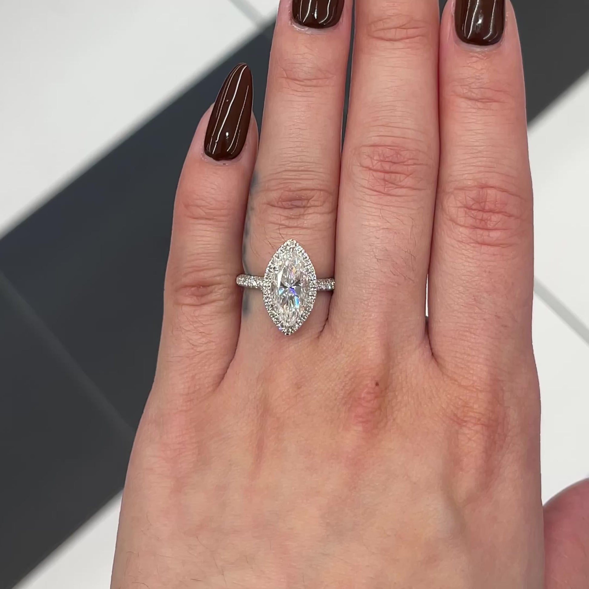 Excellent cut, polish and symmetry and is set in a classy side stones visible halo setting in real, solid 14K gold. Classic claw prongs and a delicate basket setting securely cradle the center, allowing it to shine with maximum brilliance. This gorgeous ring showcases a breathtaking 2 carat marquis-cut lab diamond center and features a visible diamond halo. The band is masterfully set 3/4 of the way around with beautiful pavé lab-grown diamonds on all three sides, completing the luxurious yet elegant engagement ring! You may customize this item by choosing either 14K yellow gold, 14K white gold or 14K rose gold.