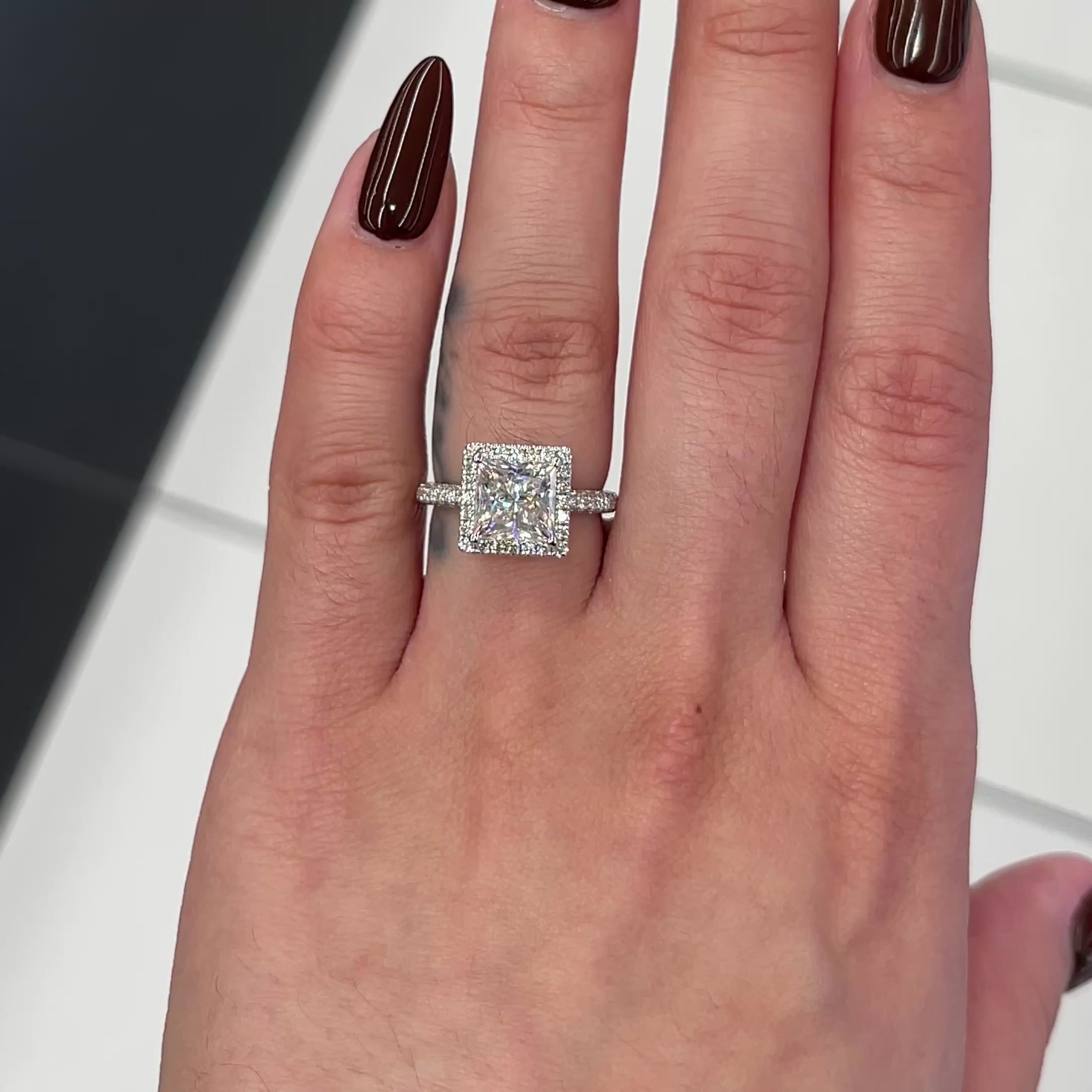 Excellent cut, polish and symmetry and is set in a classy side stones visible halo setting in real, solid 14K gold. Classic claw prongs and a delicate basket setting securely cradle the center, allowing it to shine with maximum brilliance. This gorgeous ring showcases a breathtaking 2 carat princess-cut lab diamond center and features a visible diamond halo. The band is masterfully set 3/4 of the way around with beautiful pavé lab-grown diamonds on all three sides, completing the luxurious yet elegant engagement ring! You may customize this item by choosing either 14K yellow gold, 14K white gold or 14K rose gold.