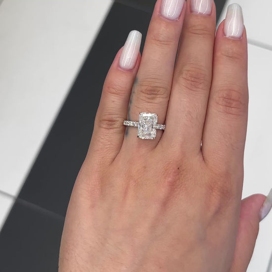 Excellent cut, polish and symmetry and is set in a classy side stones hidden halo setting in real, solid 14K gold. Classic claw prongs and a delicate basket setting securely cradle the center, allowing it to shine with maximum brilliance. This gorgeous ring showcases a breathtaking 3 carat radiant-cut diamond and features a hidden diamond halo. The band is masterfully set 3/4 of the way around with beautiful pavé lab-grown diamonds, completing the simple and elegant, yet eye-catching engagement ring! You may customize this item by choosing either 14K yellow gold, 14K white gold or 14K rose gold.
