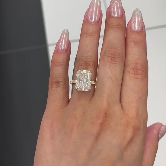 Excellent cut, polish and symmetry and is set in a classy side stones hidden halo setting in real, solid 14K gold. Classic claw prongs and a delicate basket setting securely cradle the center, allowing it to shine with maximum brilliance. This gorgeous ring showcases a breathtaking 7 carat radiant-cut diamond and features a hidden diamond halo. The band is masterfully set 3/4 of the way around with beautiful pavé lab-grown diamonds, completing the simple and elegant, yet eye-catching engagement ring! You may customize this item by choosing either 14K yellow gold, 14K white gold or 14K rose gold.